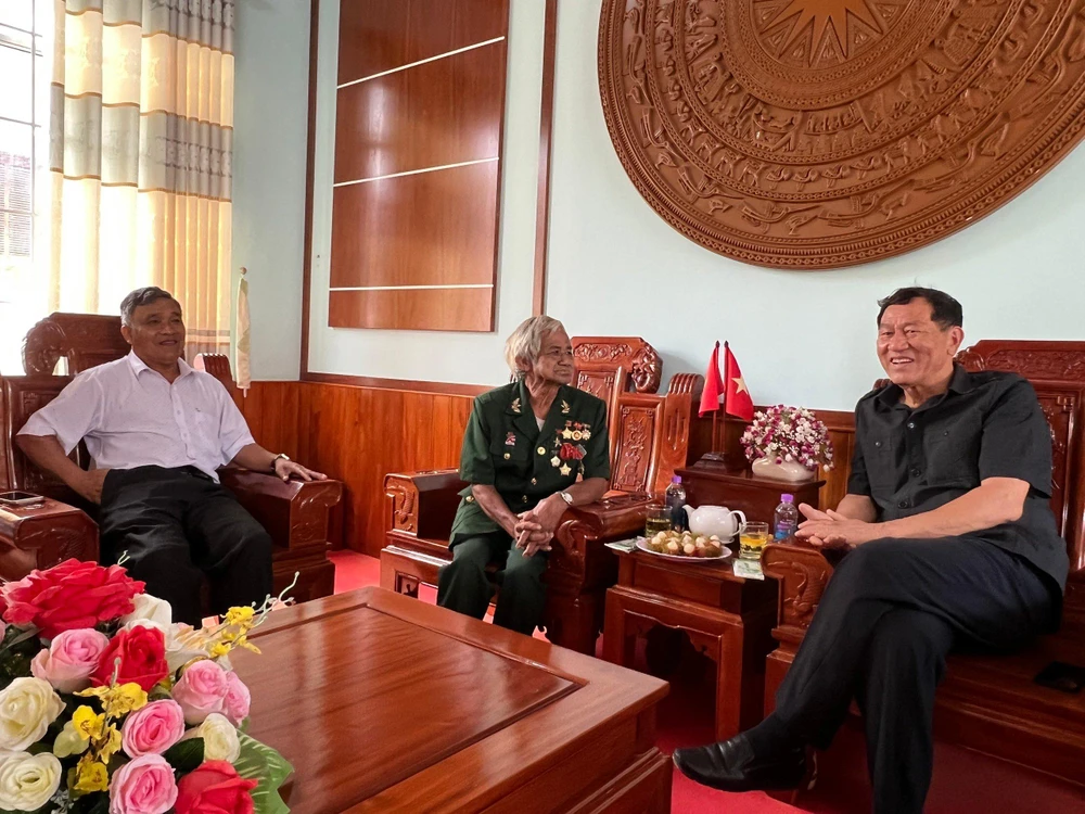Trung tướng phi công Vũ trụ Phạm Tuân, Anh hùng LLVTND (bên phải) và Anh hùng LLVTND, người con của quê hương Khánh Sơn - Bo Bo Tới (bên trái). Ảnh: CÔNG THI. |