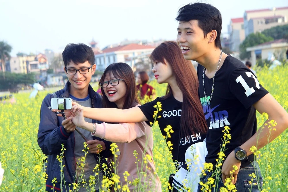 Đây chính là thời điểm hoa cải đẹp nhất. Nhiều bạn trẻ tranh thủ tới đây lưu lại những bức ảnh đáng nhớ.