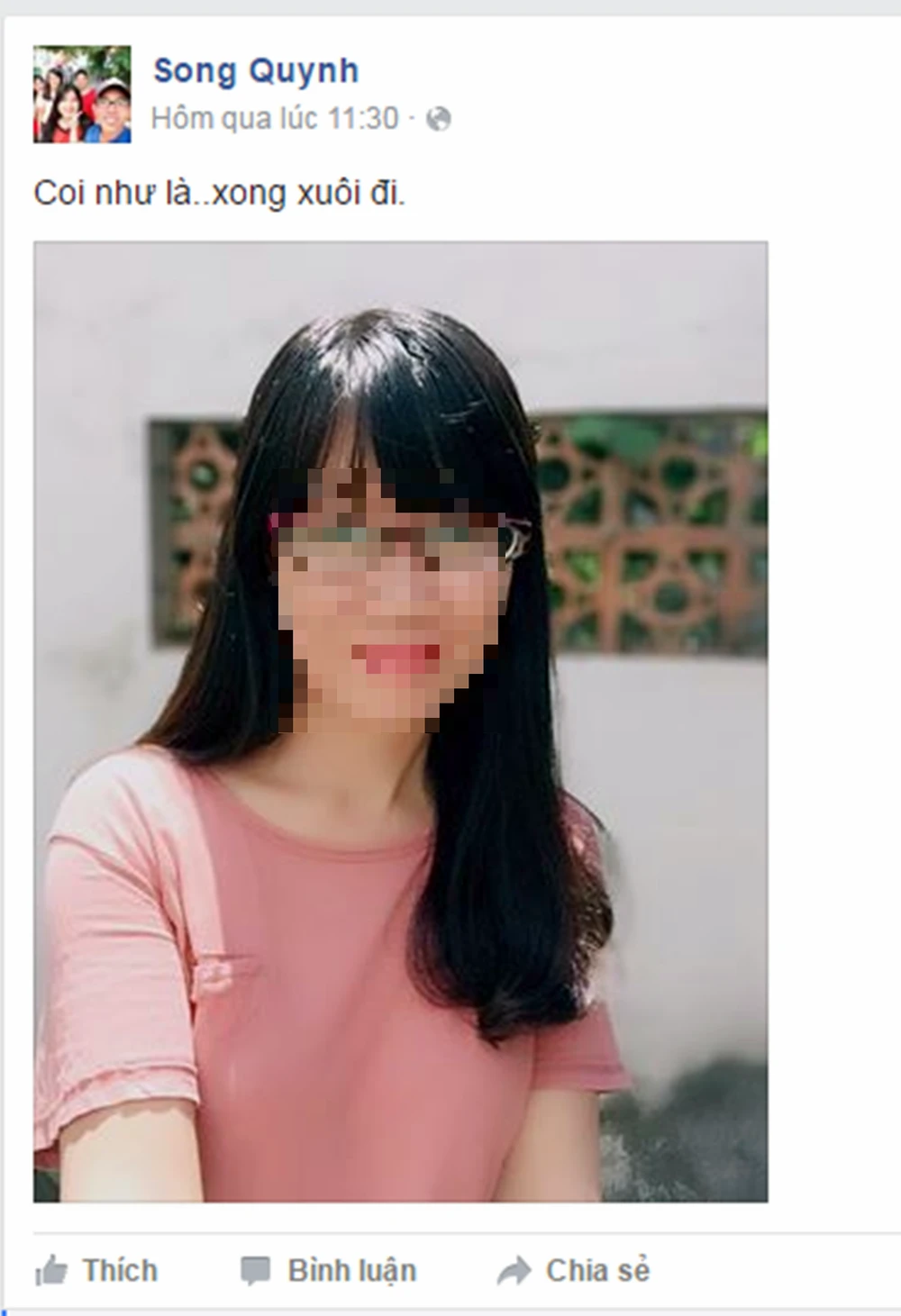 Trước đó vào lúc 11g30 ngày 18-6, cô Quỳnh có nick là Song Quynh đã đưa ảnh của mình lên và viết “Coi như là…xong xuôi đi” khiến các học sinh cho rằng cô đã linh tính đi xa và điều này càng khiến các em thương tiếc nhiều hơn.