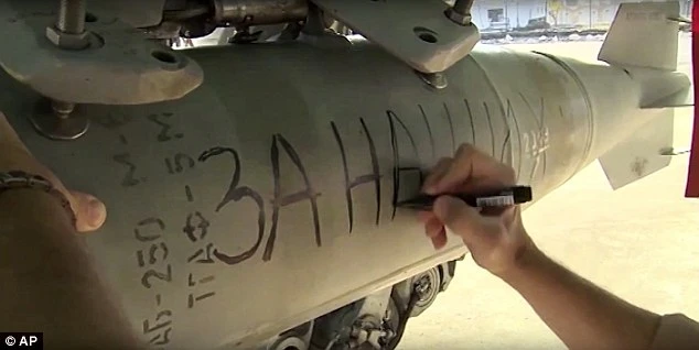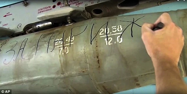 Một kỹ thuật viên Bộ Quốc phòng Nga viết “Vì chính chúng ta” lên quả bom sắp không kích IS trong video. (Ảnh: AP)