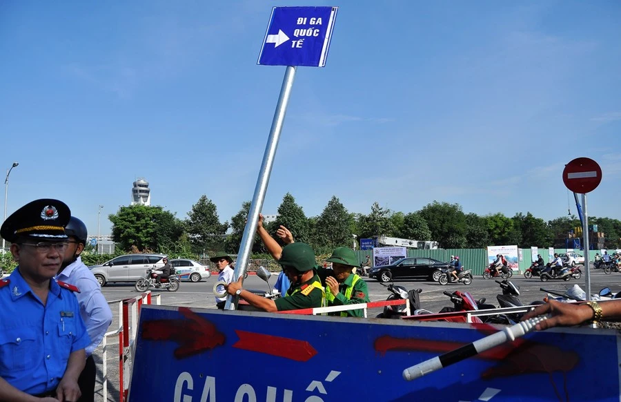 Từ trước 7 giờ 30 ngày 27-2, giao thông khu vực còn thông thoáng nhưng do việc phân luồng lại, việc ra vào sân bay khá phức tạp nên một số người đã chọn phương án đi bộ để đi tắt vào sân bay. Ảnh: MP