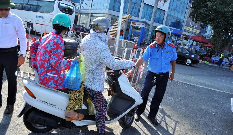 Nhiều người bất chấp biển báo, cố tình chen vào chỗ trống, đi ngược chiều cũng là nguyên nhân khiến giao thông ở khu vực này thêm phức tạp. Trong ảnh: Một phụ nữ cố gắng “đi tắt” dù bị lực lượng chức năng ngăn cản. Ảnh: MP