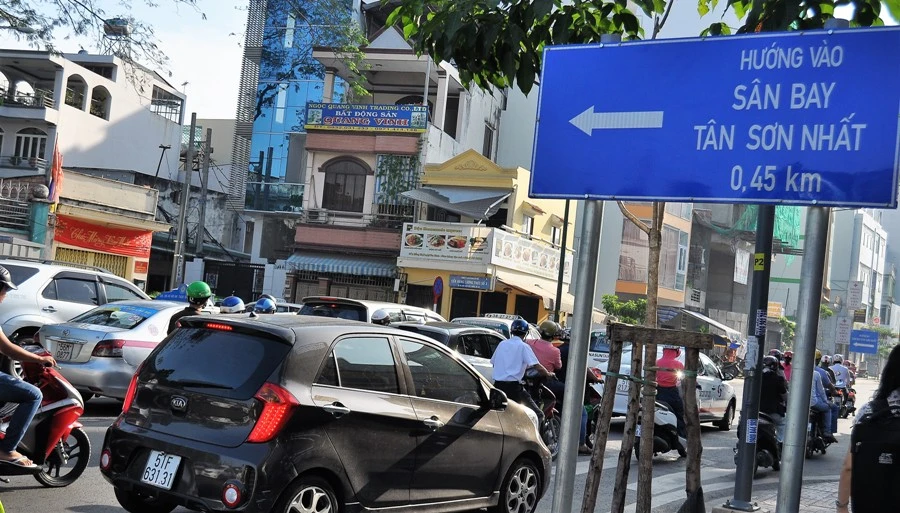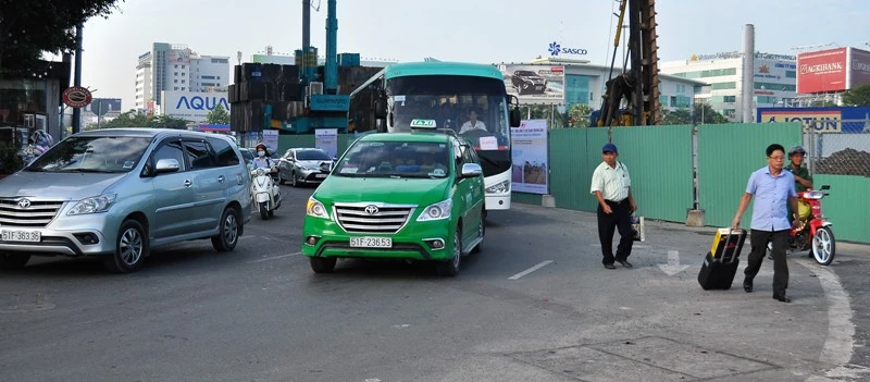 Trước cổng sân bay Tân Sơn Nhất đang được rào chắn để xây cầu vượt dẫn trực tiếp vào nhà ga quốc tế, nhà ga quốc nội, tránh giao cắt trực tiếp là nguyên nhân khiến tình trạng ùn tắc diễn ra thường xuyên trước cửa sân bay như lâu nay.