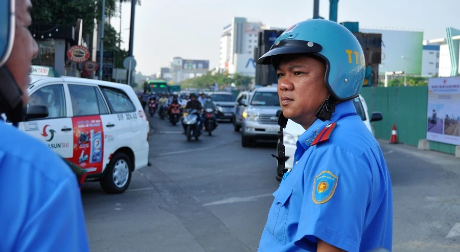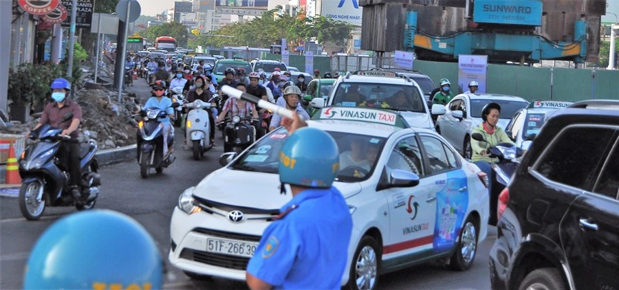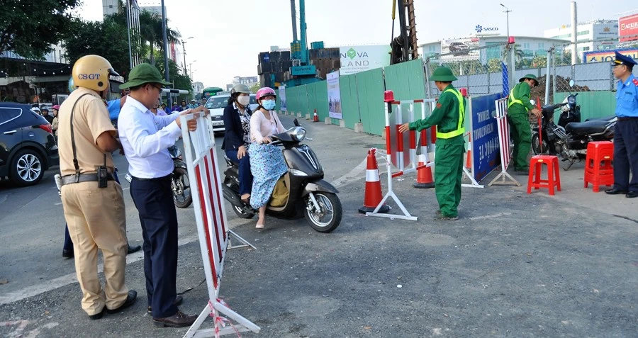 Thanh tra giao thông, CSGT của Đội CSGT quận Tân Bình, Đội CSGT Tân Sơn Nhất và lực lượng phân luồng hướng dẫn giao thông của đơn vị thi công đã có mặt từ sớm. Ảnh: MP