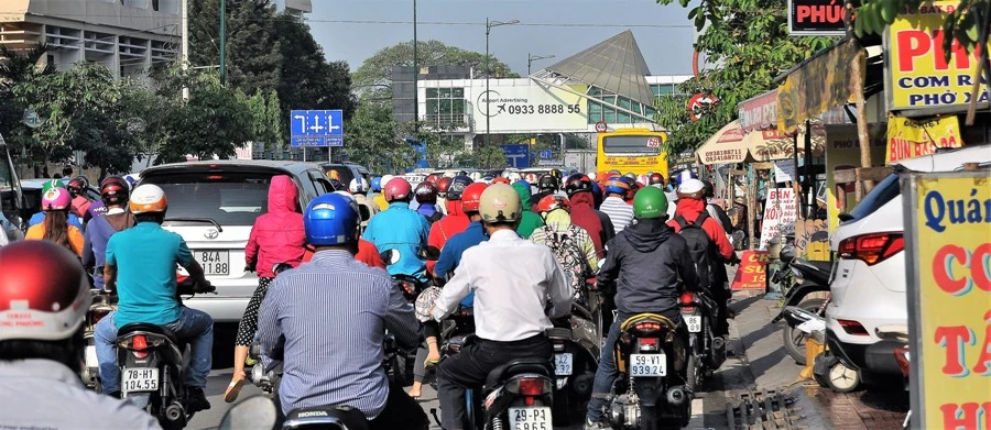 Đường Bạch Đằng đông nghẹt xe. Một người bán bánh mì trên vỉa hè đường này nói: “Đường kẹt quá, nhiều người đi xe máy phi lên vỉa hè. Tôi còn bị một người chạy xe máy tông phải”. Ảnh: MP