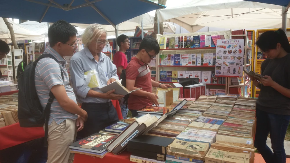 Một gian hàng sách cũ trong hội quán của nhà sách Nhã Nam thu hút nhiều đối tượng độc giả đến xem. ẢNH: THANH TUYỀN