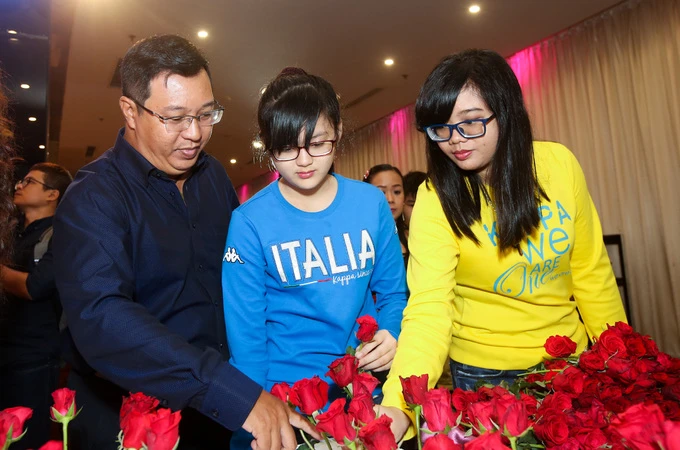 Nghệ sĩ Hồng Vân đi cùng con gái nhỏ đang tặng hoa cho Hà Linh và kế bên là Phước Sang.