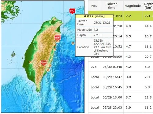 Cục Thời tiết Trung tâm Đài Loan (CWB) cho biết một trận động đất mạnh 7,2 độ richter đã xảy ra ngoài khơi bờ biển phía bắc của Đài Loan vào chiều hôm qua (31-5). Đây là trận động đất mạnh nhất tại Đài Loan trong 17 năm qua. Tuy nhiên, theo dự báo sẽ không có dư chấn.
