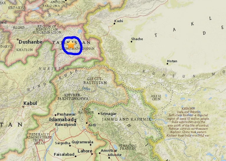 Theo Cơ quan Khảo sát địa chất Mỹ (USGS), trận động đất mạnh 7,2 độ Richter xảy ra vào trưa 7-12 theo giờ địa phương, cách phía tây khu vực Murghob của Tajikistan chừng 109 km. Tâm chấn động đất nằm ở độ sâu 28 km.