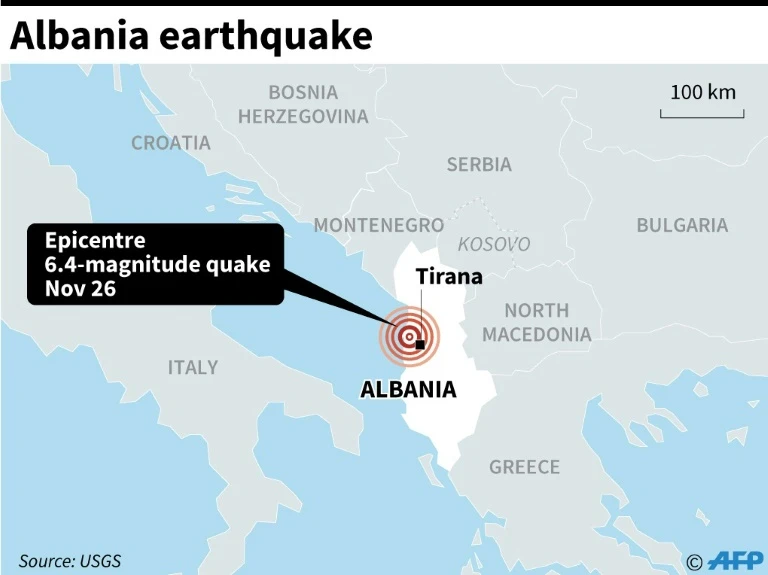 Theo Cơ quan Khảo sát địa chất Mỹ (USGC), trận động đất mạng 6,4 độ Richter đã xảy ra hồi 4 giờ sáng 26-11 (giờ địa phương). Tâm chấn cách thủ đô Tirana khoảng 30 km về phía tây và có độ sâu khoảng 10 km.