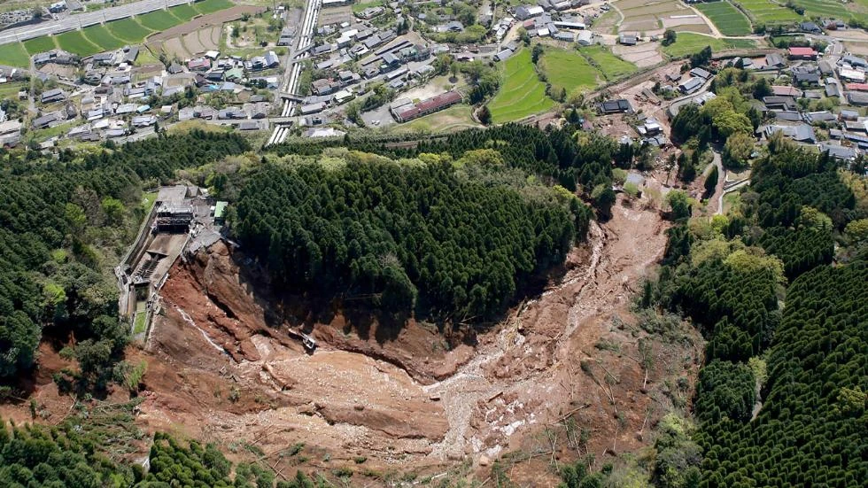 Lở đất sau động đất ở gần nhà máy điện hạt nhân Kurorawa Dai-ichi ở tỉnh Kumamoto (Nhật) ngày 16-4. (Ảnh: GETTY MAGES)
