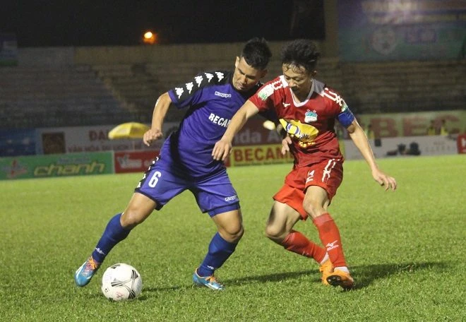 Châu Ngọc Quang (đỏ) trong pha tranh bóng cùng Hoàng Quảng của B. Bình Dương.