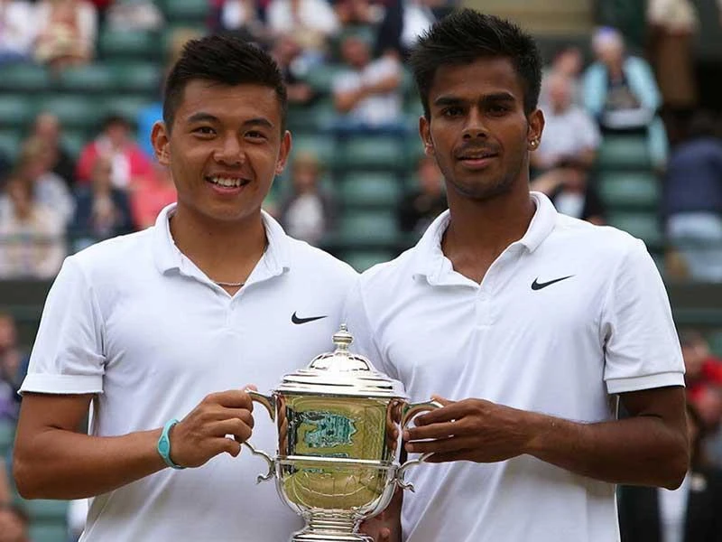 Sumit Nagal (phải) và Lý Hoàng Nam trong lần đoạt cúp đôi nam trẻ Wimbledon 2015. Ảnh: CMQ