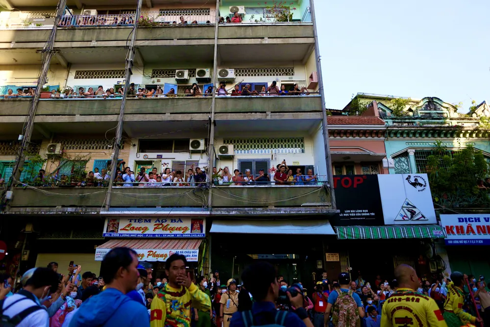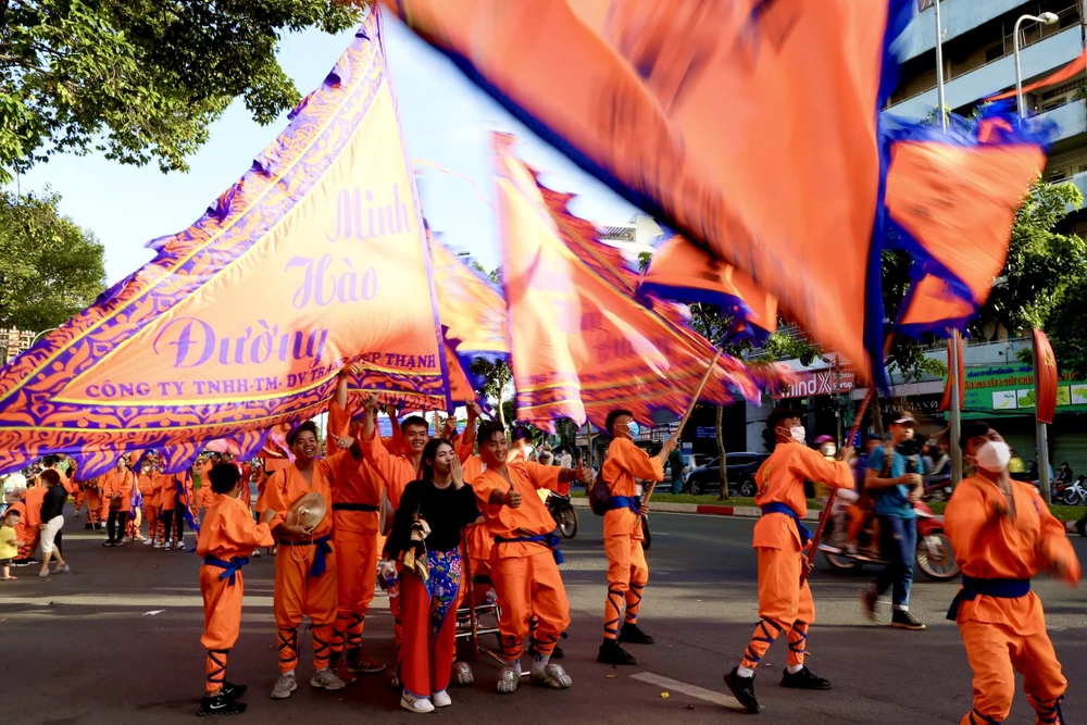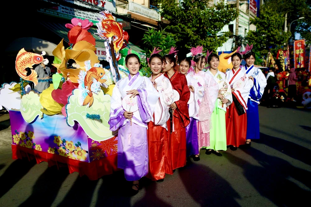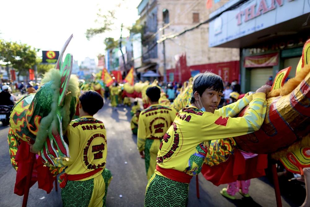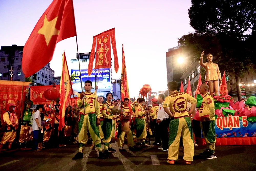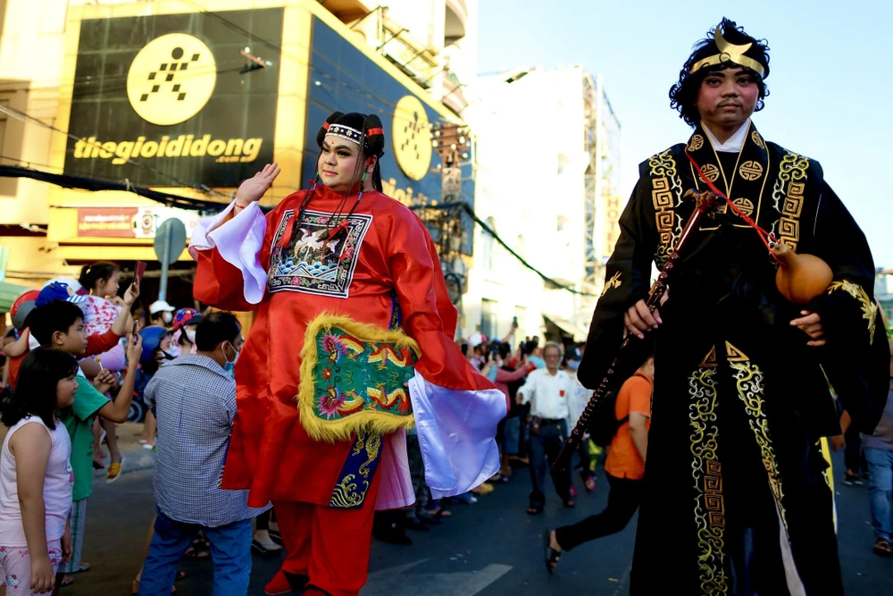 Các diễn viên hóa trang thành tiên nữ, Thần tài, thầy trò Đường Tăng, Tôn Ngộ Không… diễu hành và múa lân qua nhiều tuyến đường tại khu vực quận 5.