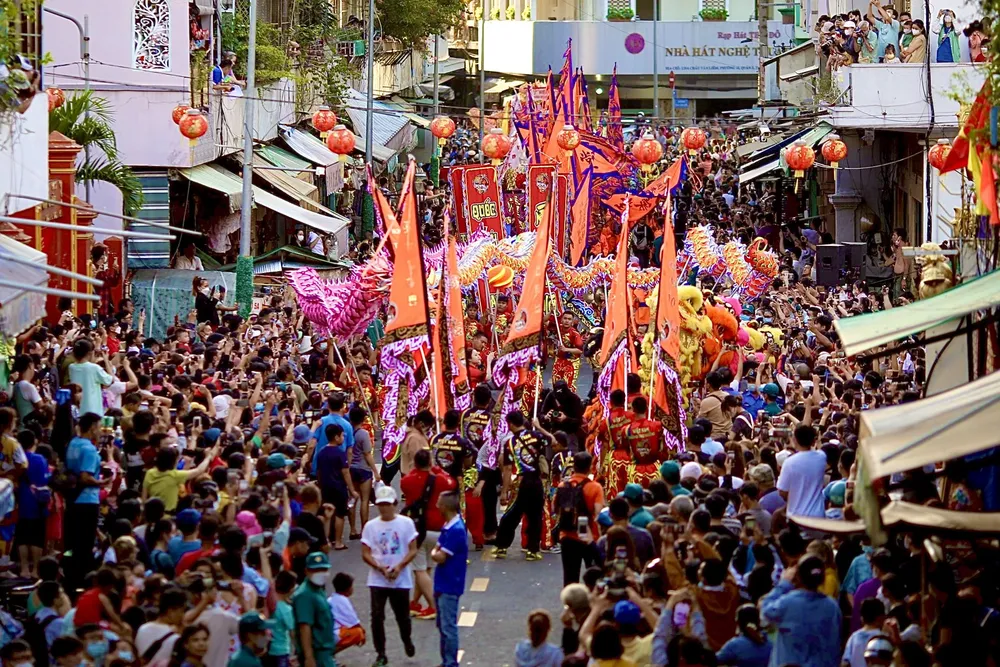 Chiều tối 5-2, hàng ngàn người dân tập trung về các tuyến đường khu vực Chợ Lớn (quận 5) theo dõi buổi diễu hành mừng tết Nguyên tiêu của người Hoa tại TP.HCM.