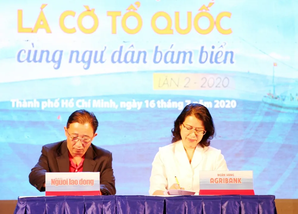 Sáng 16-7, tại lễ sơ kết một năm thực hiện chương trình “Một triệu lá cờ Tổ quốc cùng ngư dân bám biển” do báo Người Lao động tổ chức tại TP.HCM, bà Nguyễn Thị Phượng - Phó TGĐ Agribank và ông Bùi Thanh Liêm - Phó Tổng Biên tập báo Người Lao Động đã ký kết biên bản ghi nhớ đồng hành cùng chương trình “Một triệu lá cờ Tổ quốc cùng ngư dân bám biển”.