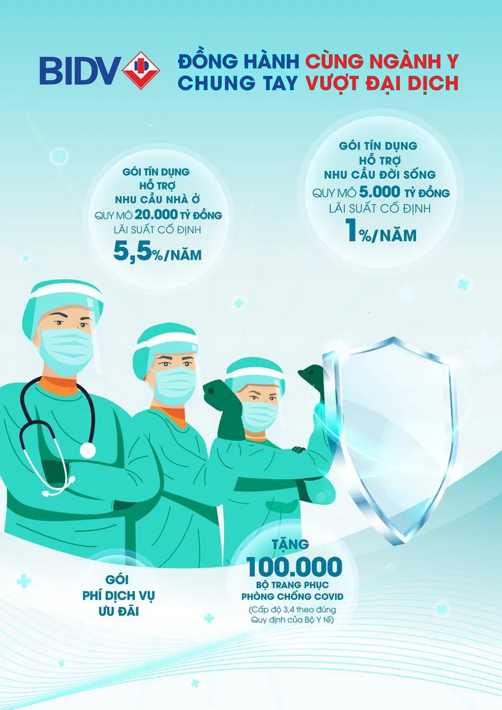 Chương trình "Đồng hành cùng ngành Y, chung tay vượt đại dịch" được BIDV triển khai trên toàn quốc gồm gói tín dụng dịch vụ đặc biệt ưu đãi hỗ trợ cán bộ y tế và tặng 100.000 bộ trang phục phòng chống dịch COVID-19, kèm phụ kiện đồng bộ, được sản xuất với tiêu chuẩn cao (cấp độ 3 hoặc 4) theo đúng quy định của Bộ Y tế, cho các bệnh viện, cơ sở y tế. Tổng chi phí BIDV hỗ trợ lên tới 1.670 tỉ đồng.
