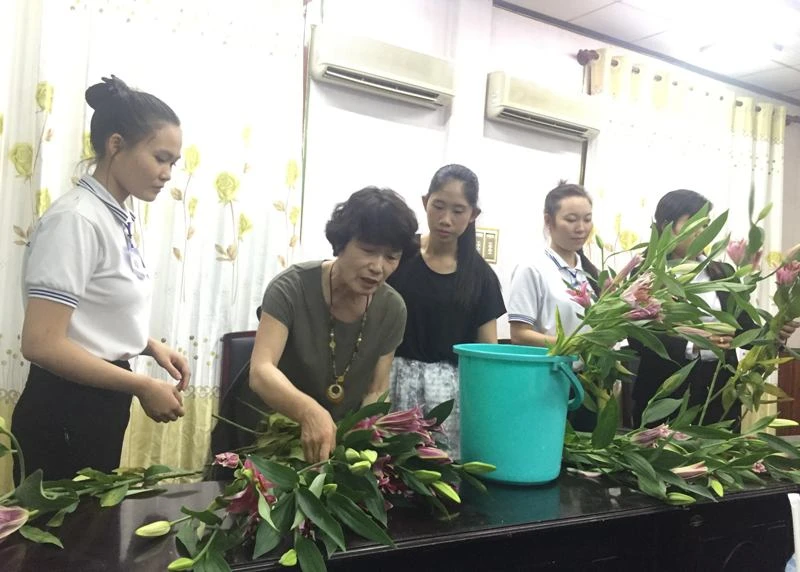 Chủ doanh nghiệp Nhật hướng dẫn thực tập sinh tham gia bài thực hành thu gom hoa trước khi sang Nhật làm việc. Ảnh: P.ĐIỀN