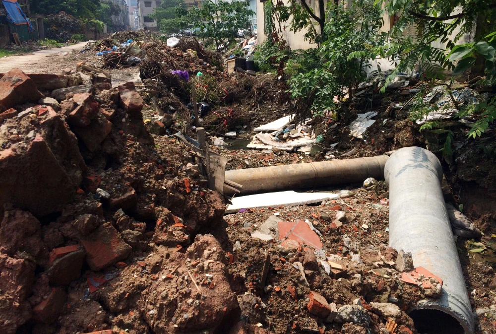 Cộng thêm con đường phía trên đang làm dở dang chưa hoàn thành, kênh nước không lối thoát, bốc mùi hôi thối.