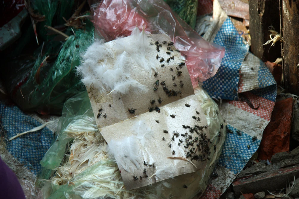 Mặc dù người dân dùng nhiều biện pháp để diệt ruồi muỗi nhưng tình trạng không thay đổi là mấy. Trong hình là miếng keo dán đầy ruồi.