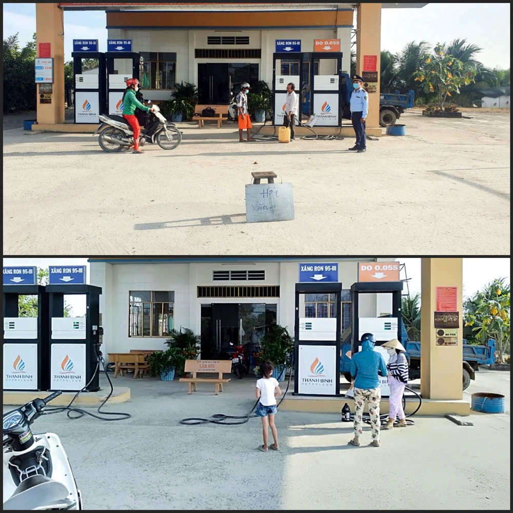 Ngày 7-2, qua kiểm tra thực tế tại thị xã Gò Công, đoàn ghi nhận cửa hàng xăng này hết xăng để bán (ảnh trên) và đã nhập hàng bán lại trong chiều 8-2 (ảnh dưới). Ảnh: Tổng Cục QLTT