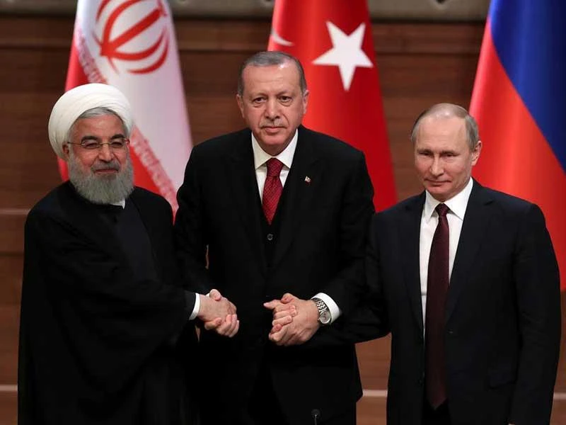 Từ trái sang: Tổng thống Iran Hassan Rouhani, Tổng thống Thổ Nhĩ Kỳ Tayyip Erdogan và Tổng thống Nga Vladimir Putin tại một cuộc họp báo ở Thổ Nhĩ Kỳ năm 2018. Ảnh: REUTERS