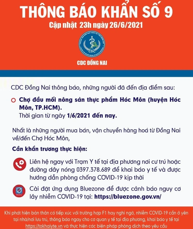 CDC Đồng Nai đề nghị những người mua bán, vận chuyển hàng hoá từ Đồng Nai về, đến chợ mối nông sản thực phẩm Hóc Môn khẩn trương liên hệ ngay với Trạm Y tế tại địa phương nơi cư trú để khai báo y tế và được hướng dẫn phòng chống Covid-19 kịp thời.