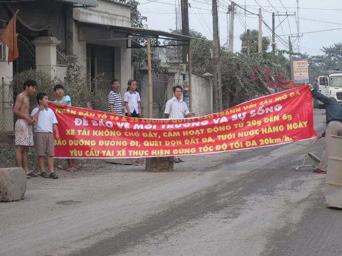 Băng rôn có nội dung: “Nhân dân tổ 24 và 25 cương quyết đấu tranh với các mỏ đá để bảo vệ môi trường và sự sống. Xe tải không chở đầy, cấm hoạt động từ 20 giờ đến 6 giờ, bảo dưỡng đường đi, quét dọn đất đá, tưới nước hàng ngày. Yêu cầu tài xế thực hiện đúng tốc độ tối đa 20km/giờ”.