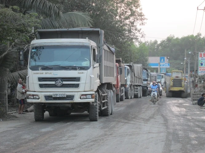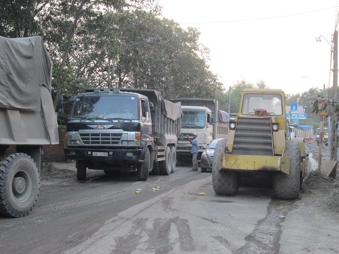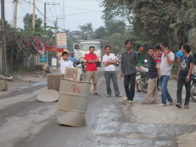 Ngoài ra, người dân còn dùng đá, vỏ xe, thùng phuy, rào chắn…làm vật cản không cho xe tải lưu thông qua lại. Do vậy hàng chục chiếc xe ben chở đá ra vào mỏ đá Tân Cang nối đuôi nhau nằm trên đường khiến việc lưu thông qua khu vực gặp rất nhiều khó khăn.