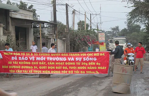 Ngoài việc dùng đá, vỏ xe, thùng phuy… làm vật cản, người dân còn căng băng rôn cấm đường. Hàng chục chiếc xe ben chở đá nằm nối đuôi nhau trên đường.