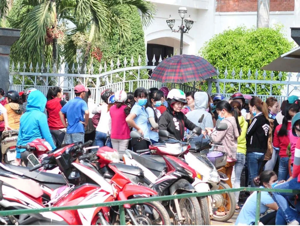 Công nhân vây cổng công ty khi chủ doanh nghiệp không trả lương . Ảnh: VH.