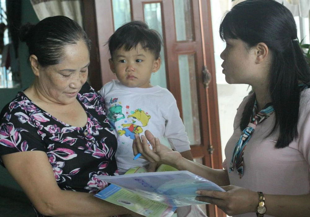 Nhiên viên hướng dẫn người dân cách diệt lăng quăng. Ảnh: Vũ Hội.