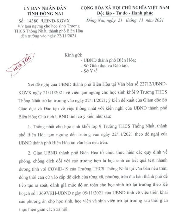 Trước tình hình này, chiều cùng ngày, UBND TP Biên Hòa đã có văn bản Gửi UBND tỉnh và Sở Giáo dục - đào tạo kiến nghị tạm ngưng tổ chức thực hiện cho học sinh khối 9 trường THCS Thống Nhất trở lại trường vào ngày 22-11-2021. Bởi hiện nay, học sinh Trường THCS Thống Nhất cư ngụ tại các phường: Thống Nhất, Quyết Thắng, Quang Vinh, Hoà Bình, Trung Dũng,… và tình hình nhiễm không triệu chứng ở các địa phương vẫn diễn biến phức tạp.