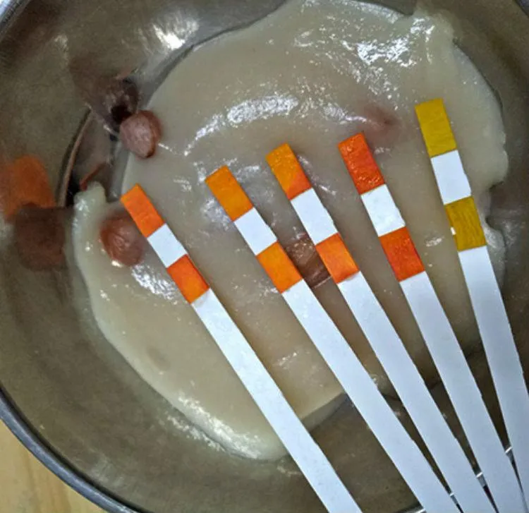 Kết quả thử hàn the trên mẫu bánh đúc của quán bún đậu (que thử ngoài cùng bên phải là que đối chứng, 4 que thử còn lại đều dương tính với hàn the).