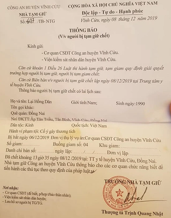 Ngày 25-12, Công an tỉnh Đồng Nai vẫn đang điều tra nguyên nhân về cái chết của Lại Hồng Dân (29 tuổi, ngụ xã Tân Bình, huyện Vĩnh Cửu, Đồng Nai) nghi bị đánh trong buồng giam.