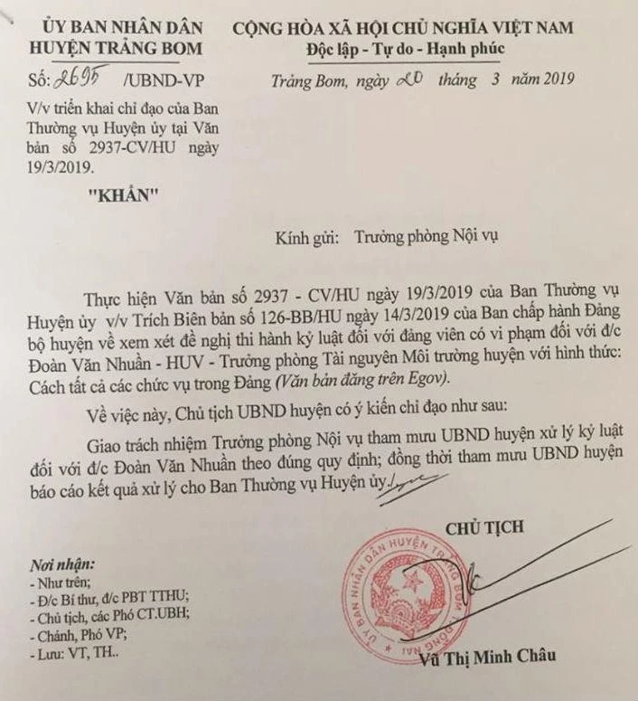 Văn bản chỉ đạo của UBND huyện Trảng Bom xử lý ông Nhuần.