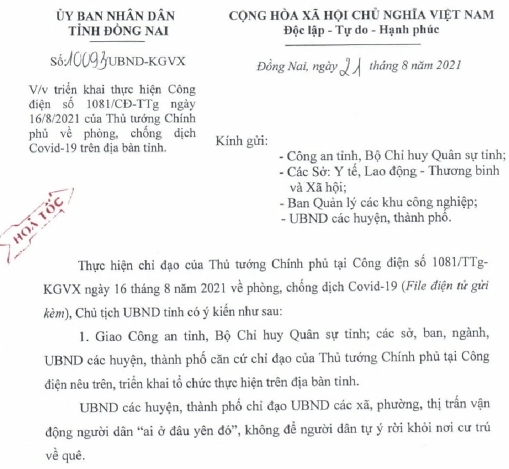 Ngày 21-8, UBND tỉnh Đồng Nai ra văn bản hỏa tốc về việc triển khai thực hiện Công điện của Thủ tướng Chính phủ về phòng, chống dịch COVID - 19 trên địa bàn tỉnh .
