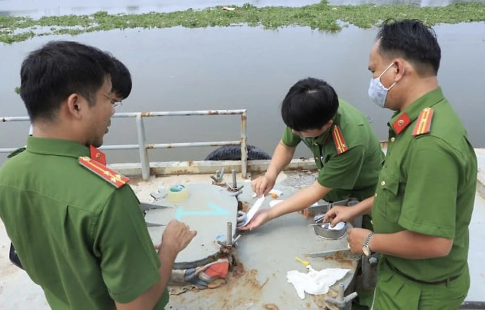Công an bắt giữ xà lan chở xăng giả, kém chất lượng đi tiêu thụ. Ảnh: CACC