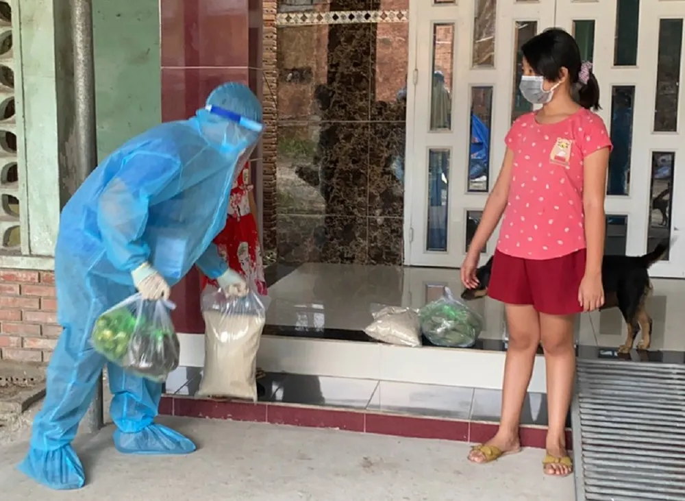 Đoàn viên của Thành đoàn Biên Hòa phát gạo, thực phẩm cho người dân trong vùng bị phong tỏa ở TP Biên Hòa. Ảnh: Xuân Viên.