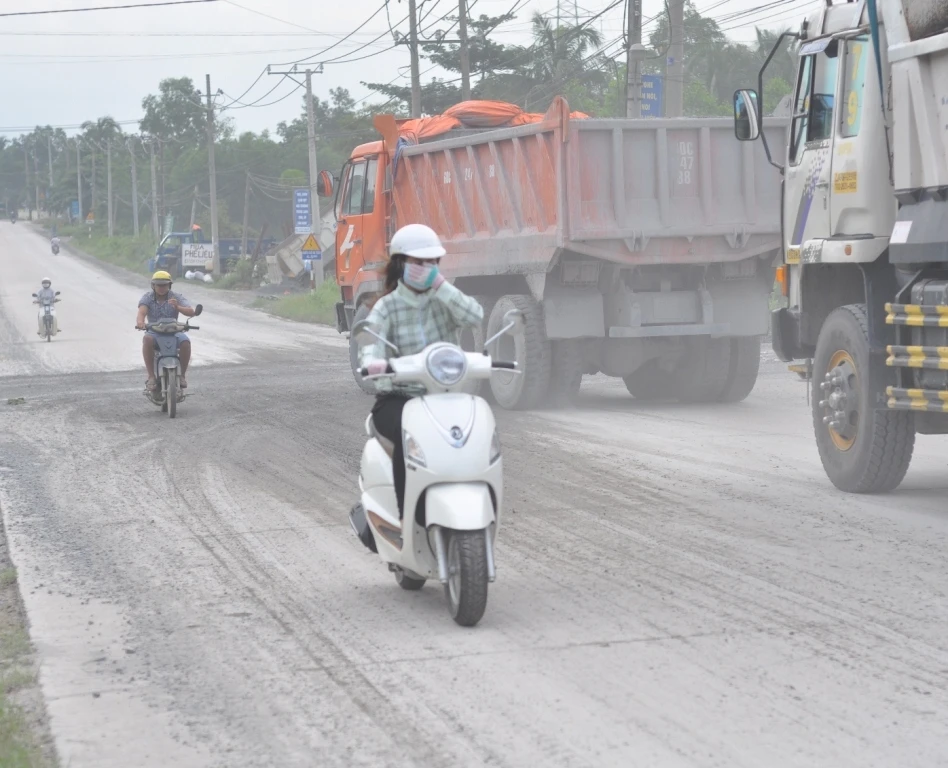 Người dân lưu thông trên đường ĐT 768 mặc dù đã đeo khẩu trang nhưng vẫn đưa tay bịt miệng khi xe chở đá chạy qua. Ảnh: TIẾN DŨNG