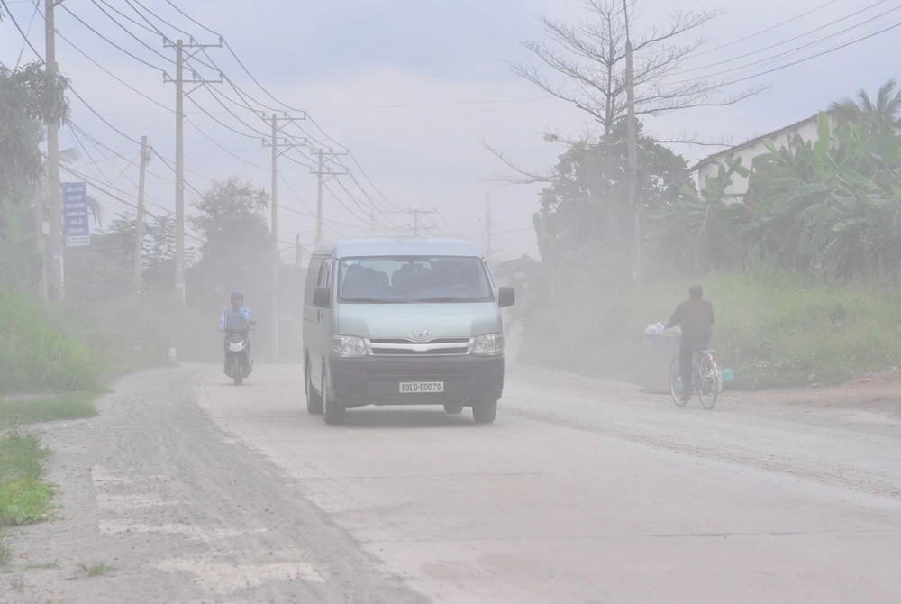 Đường ĐT 768 đoạn đi qua các mỏ đá ở huyện Vĩnh Cửu lúc nào cũng bụi như sương mù. Ảnh: TIẾN DŨNG