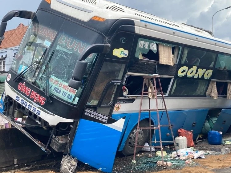 Tại hiện trường, chiếc xe khách vỡ nát phần đầu và phần kính. Hành khách trên xe một phen hoảng loạn, may mắn chỉ bị trầy xước nhẹ.