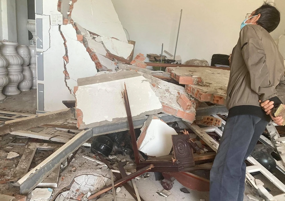 Tường căn nhà đổ sập, rất may lúc xảy ra tai nạn nhà không có ai. Ảnh: VH