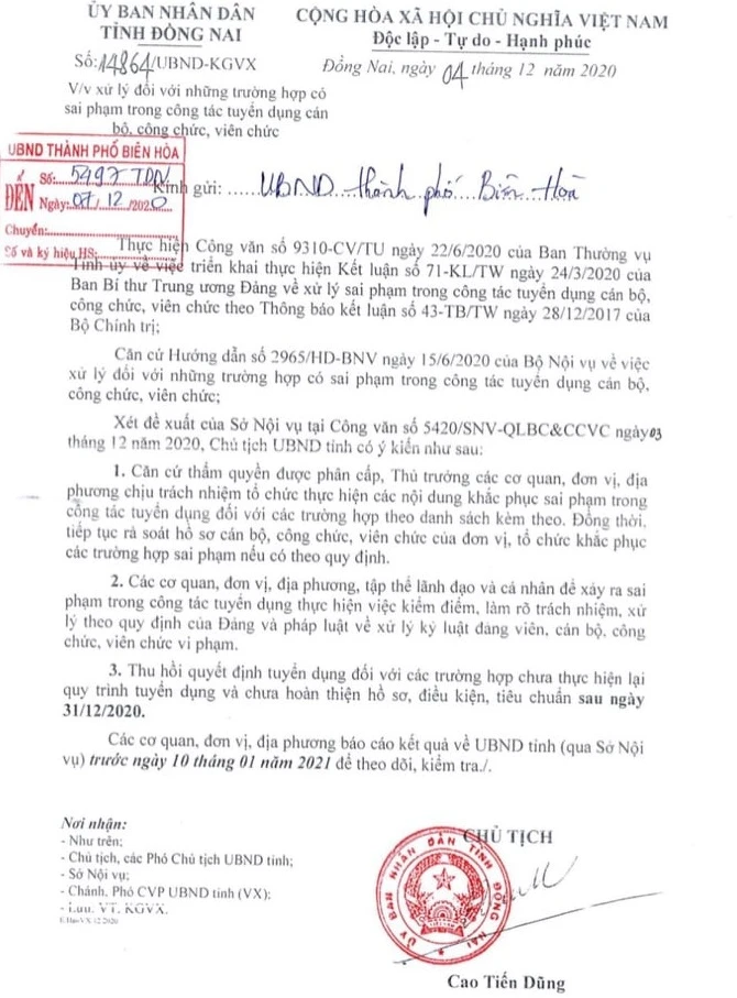 Chủ tịch UBND tỉnh Đồng Nai Cao Tiến Dũng vừa ký công văn chỉ đạo xử lý sai phạm trong công tác tuyển dụng đối với 358 cán bộ, công chức, viên chức tại các đơn vị thuộc UBND TP Biên Hòa.