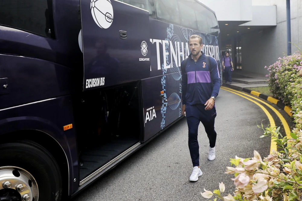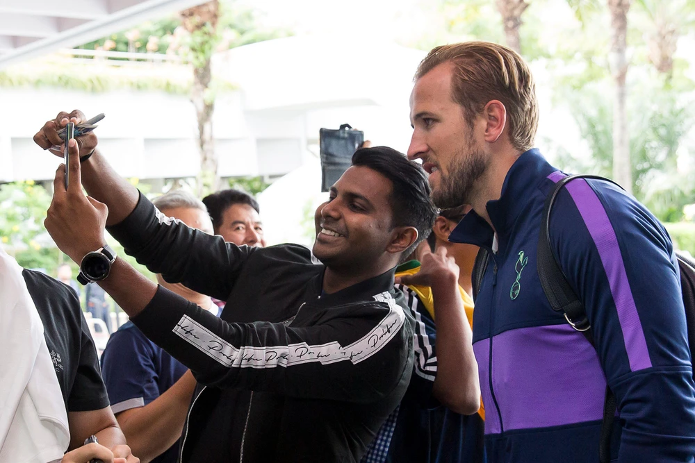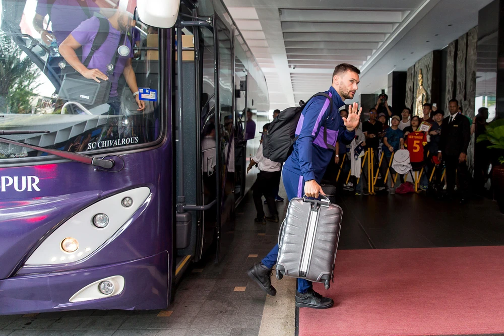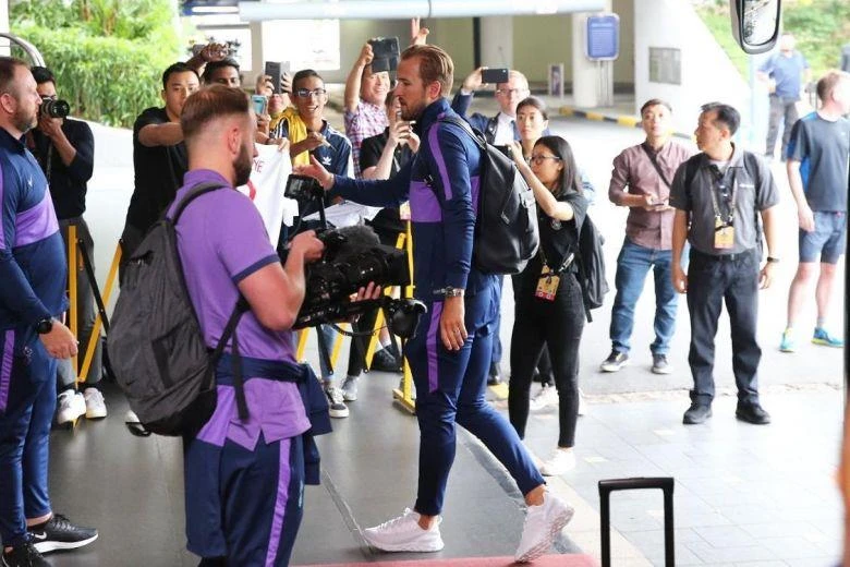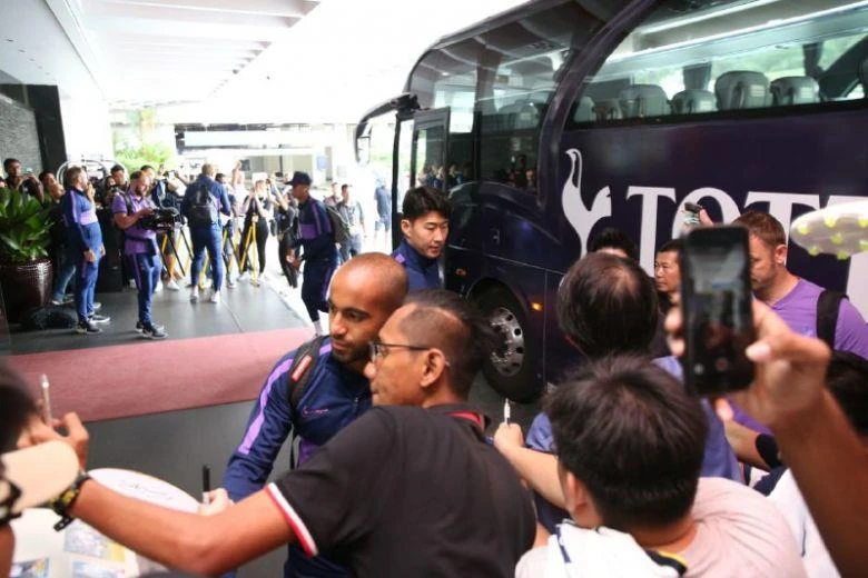 Các cầu thủ Tottenham đến Singapore trong vòng vây của người hâm mộ. ẢNH: HUY PHẠM.