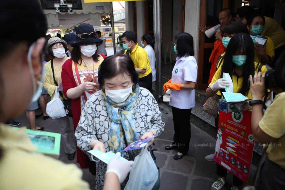 Người dân nhận khẩu trang miễn phí tại một trung tâm mua sắm ở thủ đô Bangkok, Thái Lan, ngày 29-4. Ảnh: REUTERS