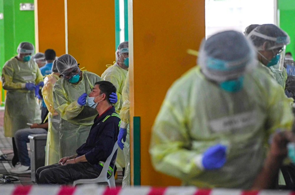 Nhân viên y tế Singapore xét nghiệm COVID-19 ở bệnh viện Tan Tock Seng ngày 29-4. Ảnh: AP