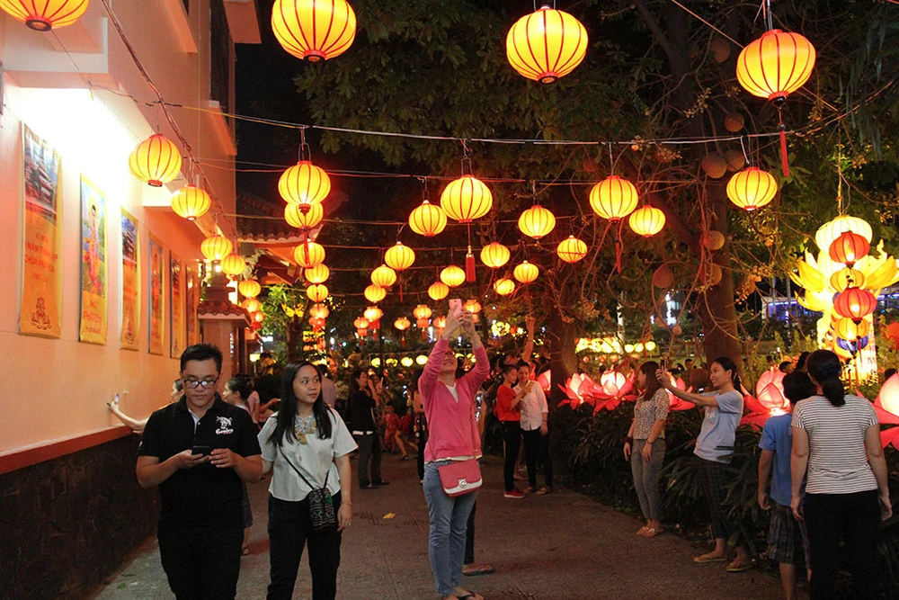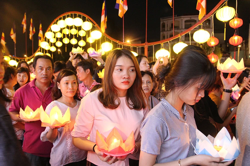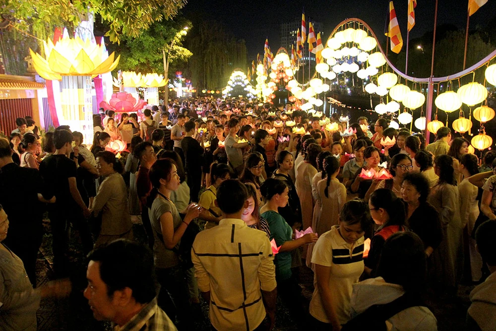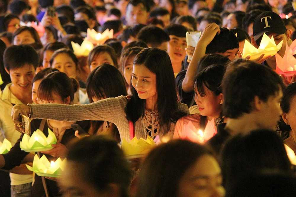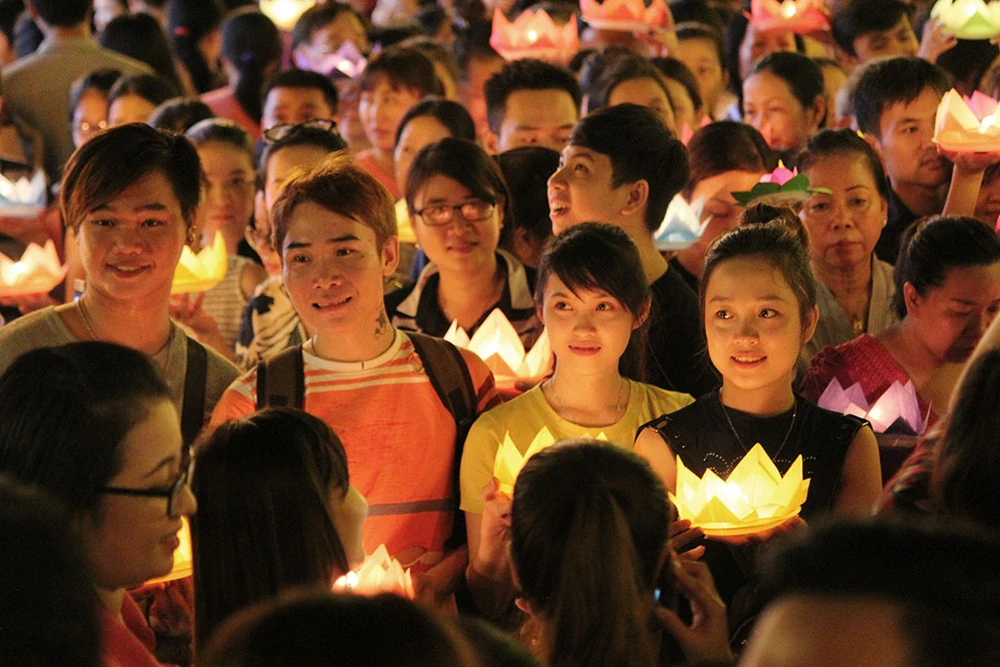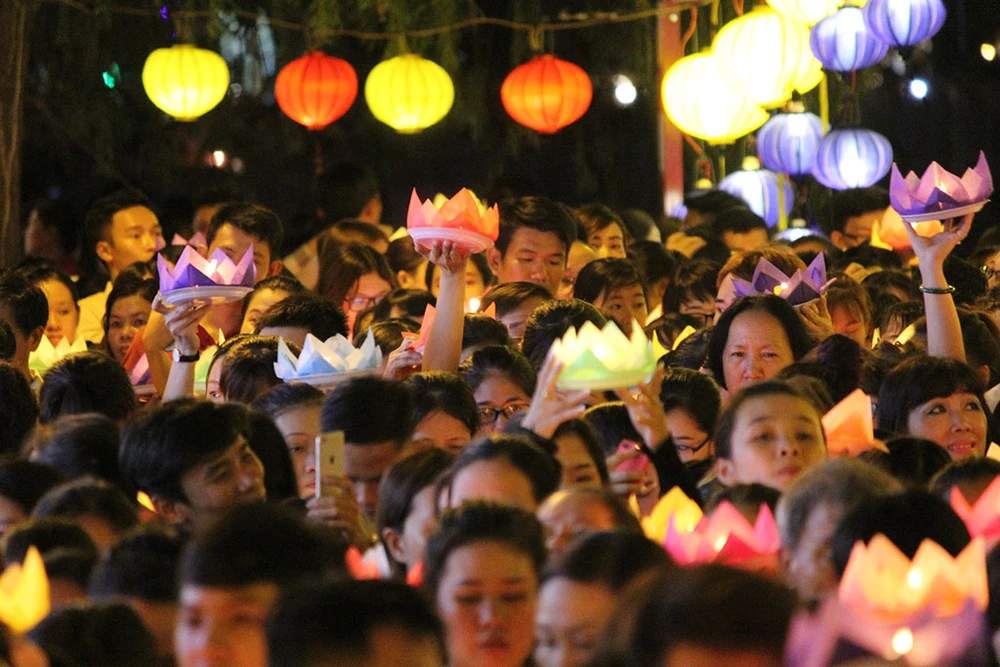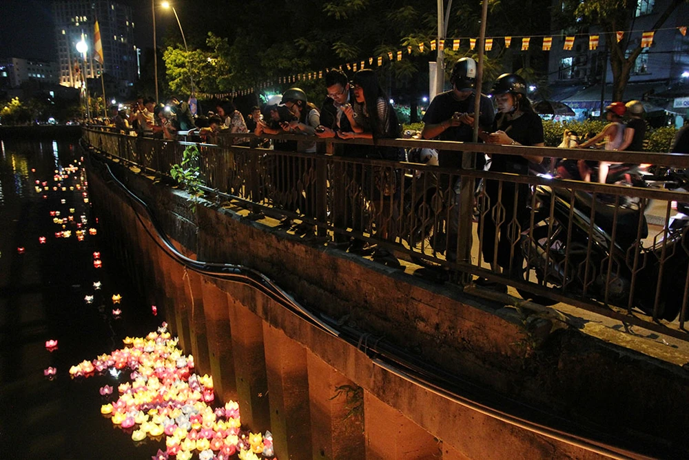 Hàng ngàn người trên tay cầm hoa đăng di chuyển từ trong chùa ra dọc bờ kênh Nhiêu Lộc để thực hiện nghi thức thả hoa đăng.