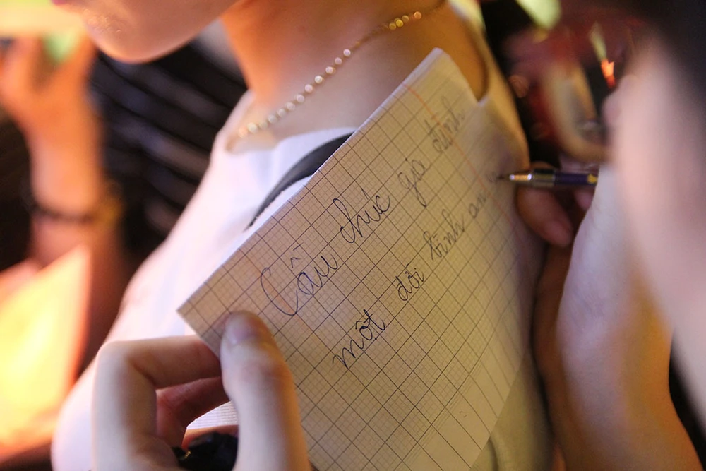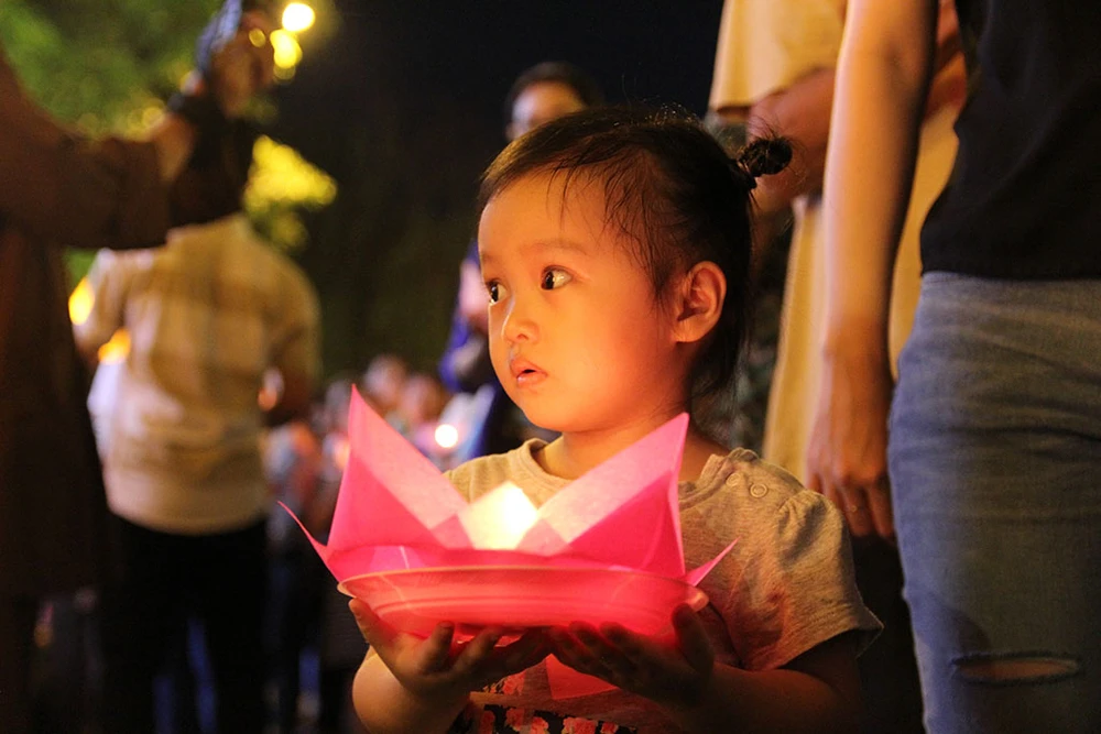 Một em nhỏ cầm trên tay hoa đăng để thả trong buổi tối.