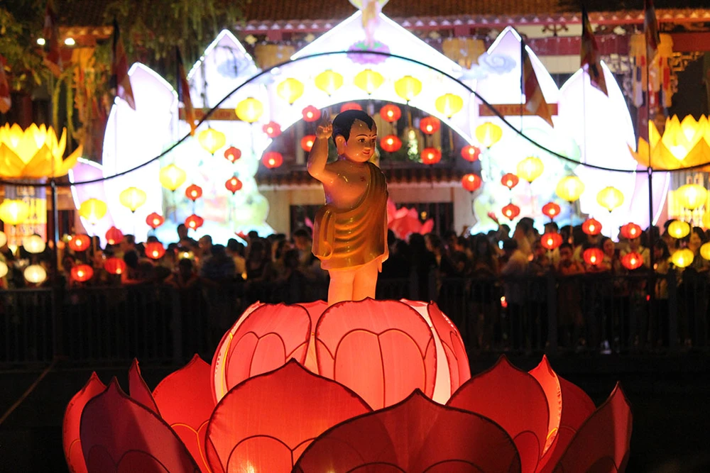 Hình ảnh Phật trên hoa sen được thắp sáng trên kênh Nhiêu Lộc.